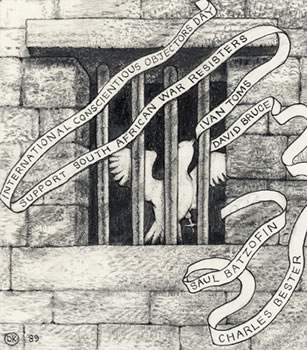 All issues of Resister were banned both for distribution and import in South Africa. It was also very difficult to obtain photographs of sensitive military content. The illustrations that COSAWR artists contributed therefore made a great difference to the impact of the text. The illustrations and texts were mostly anonymous in order to protect supporters from various forms of reprisal such as letter bombs.